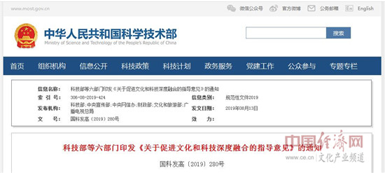 为促进文化和科技深度融合,全面提升文化科技创新能力,转变文化发展方式,推动文化事业和文化产业更好更快发展,更好满足人民精神文化生活新期待,增强人民群众的获得感和幸福感,科技部、中央宣传部、中央网信办、财政部、文化和旅游部、广播电视总局共同研究制定了《关于促进文化和科技深度融合的指导意见》。现印发给你们,请认真贯彻执行。