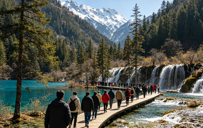 - 山上梨花竞相绽放,游客在花间打卡拍照;山下市集烟火缭绕,花香与吆喝声交织相融……