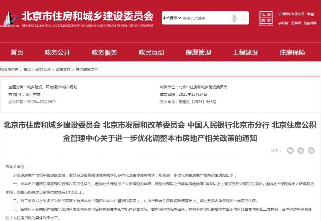 据北京市住房和城乡建设委员会消息,12月24日,北京市住房城乡建设委、市发展改革委、人民银行北京市分行、北京住房公积金管理中心等4部门联合印发《关于进一步优化调整本市房地产相关政策的通知》(以下简称《通知》),自2025年12月24日起施行。