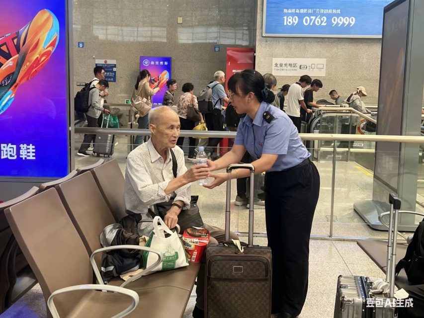 10月2日,队员马文爽负责协助一位独自出行、行动不便的老年旅客换乘。她不仅提前等候、细心安置,更在老人发现降压药遗失后,第一时间联系机场,并递上温水安抚。当药物在十分钟内被送达时,旅客紧握她的手,连声道谢:“你们想得太周到了,就像自己家人一样!”临别时,老人执意送出的那块月饼,甜到了马文爽的心里,也温暖了整个站台。