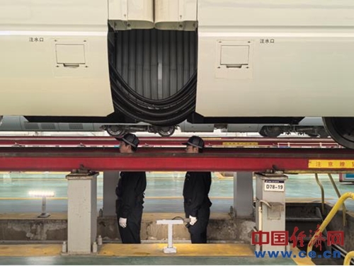 地勤机械师对走行部螺栓、轮对踏面等关键部位进行细密排查。 中国经济网 记者 魏金金 摄