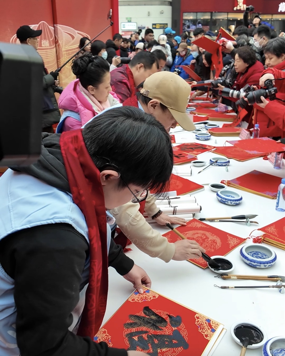 “旅途贺新春、温暖回家路”春运送温暖文明实践活动在北京南站候车大厅上演。书法家们为旅客书写福字。中国经济网记者鞠然/摄