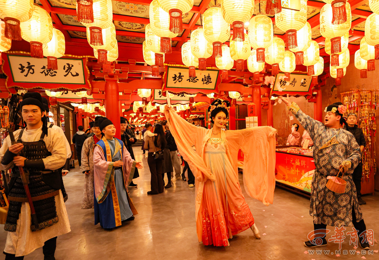 “我们不仅提取唐文化中的历史典故与人物形象,更注重将其转化为具有情感温度、互动体验的文商旅产品。”长安十二时辰主题街区文化大使李媛媛介绍,通过唐风置景、沉浸式NPC历史人物对话,全方位构建出一个鲜活的“盛唐长安”,为游客带来从“入景”到“入戏”的多维体验。