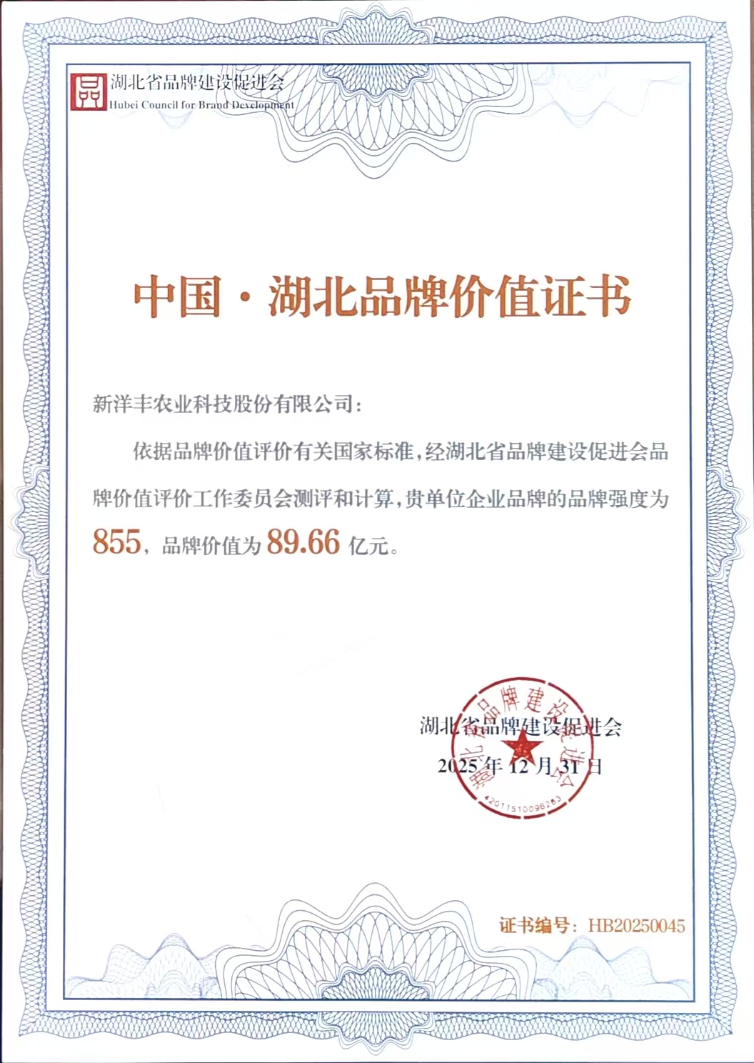 此次荣获湖北品牌价值证书,是对新洋丰深耕“双主业”领域,推动区域品牌影响力提升的最佳印证。面向未来,新洋丰将持续激活创新因子,以扎实的产品创新力与深入人心的服务力筑牢品牌根基,为湖北乃至全国经济高质量发展贡献更大力量。