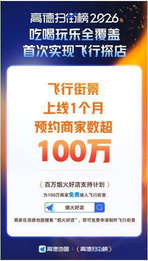 据高德扫街榜负责人介绍,为支持商户在春节期间降本增效,扫街榜推出了专项激励方案:新开通“飞行街景”的商户,最高可获得价值20万元的广告流量激励及相关权益,旨在鼓励更多中小商户拥抱AI数字化经营。截至目前,全国申请预约开通该功能的商家已突破100万家。
