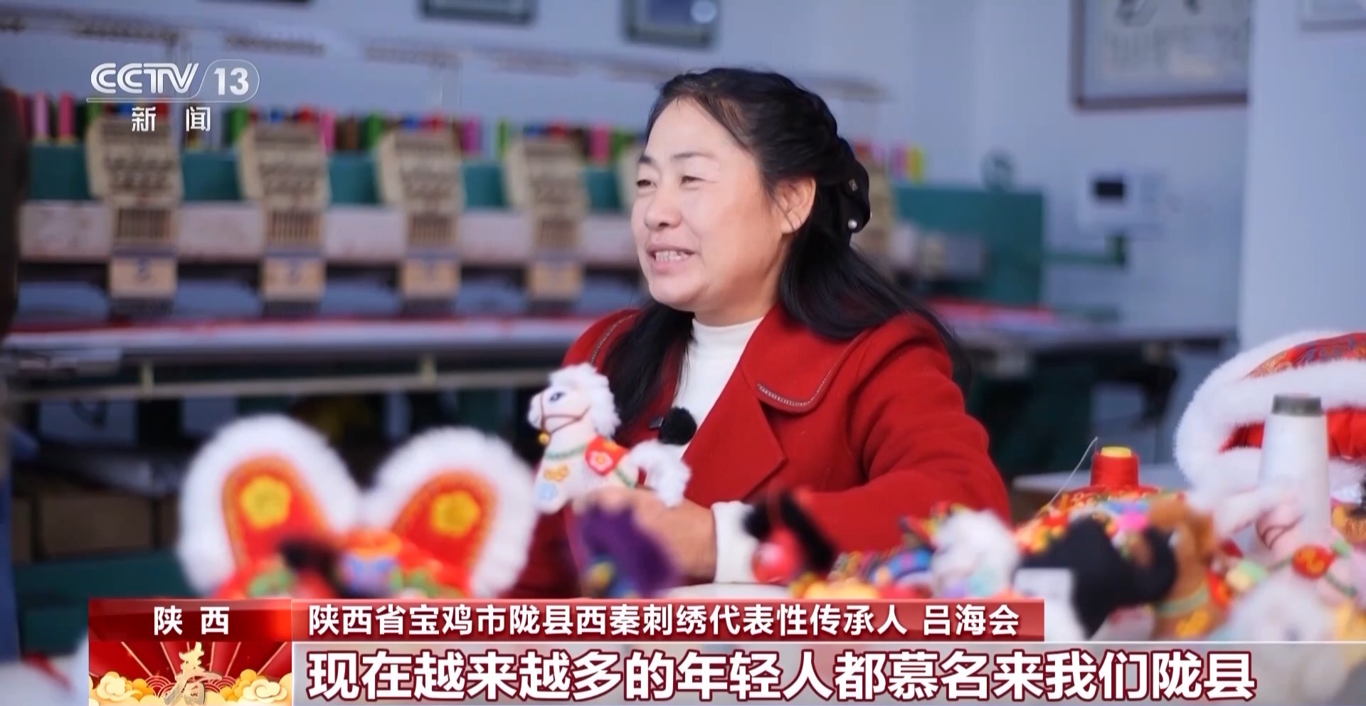 陕西省宝鸡市陇县西秦刺绣代表性传承人 吕海会:现在越来越多年轻人都慕名来我们陇县看马社火,也让更多的人了解到西秦刺绣、喜欢西秦刺绣。我们在家门口传播手工布艺的同时,也让大家得到一份收入,心里非常开心。