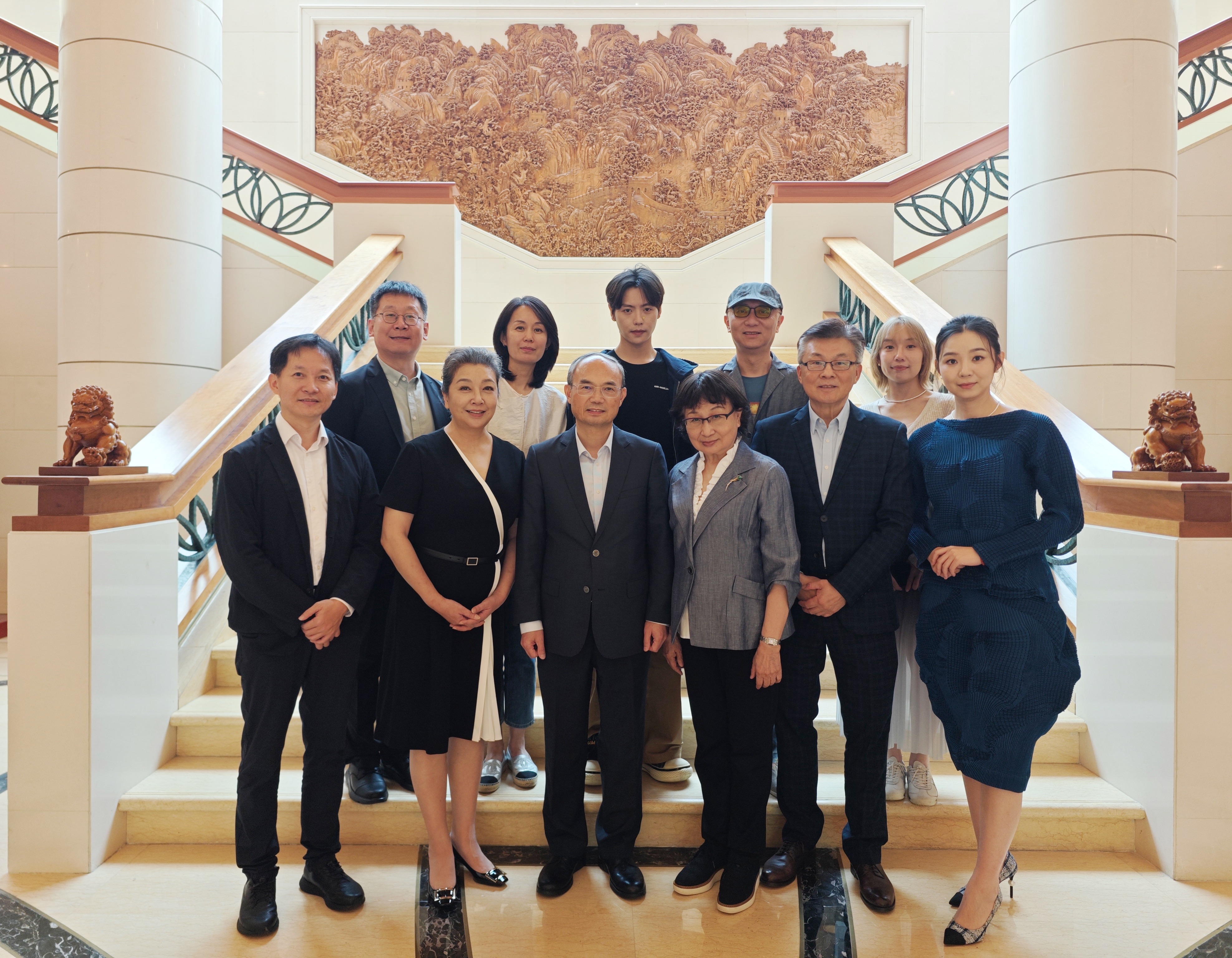 中国驻新加坡大使曹忠明(前排左三)、文化参赞蔡山帝(前排左一)接见话剧《德龄与慈禧》剧组代表
