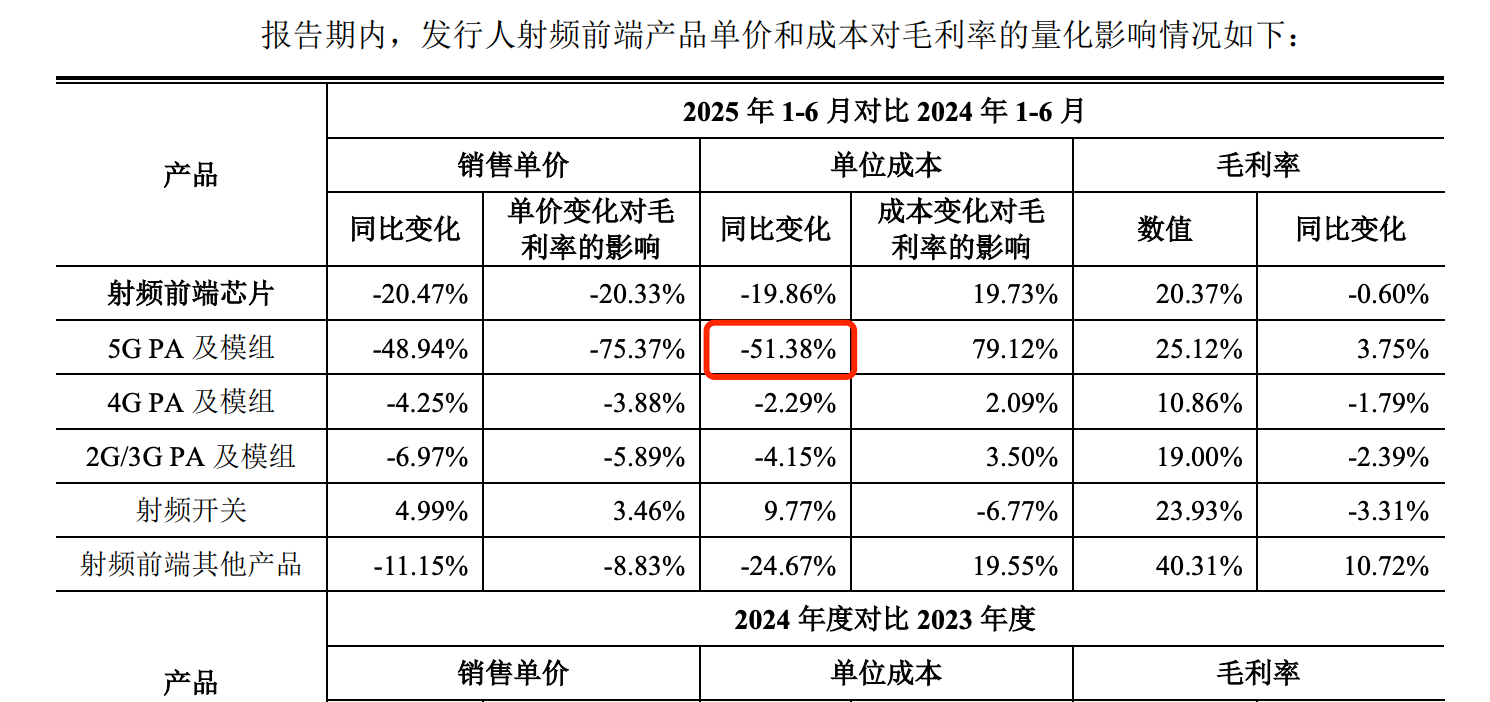 根据昂瑞微在二轮问询回复中披露的数据,2025年上半年,其5G PA及模组的销售单价同比大幅下滑36%。射频前端芯片从2023年、2024年到2025年上半年,单价分别是1.53、1.24和1.08,降幅分别为19%和13%,其中5G PA及模组,单价分别为3.30、3.21和2.04,降幅分别为3%和36%。