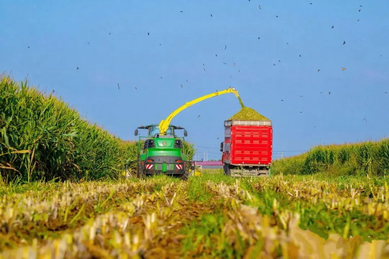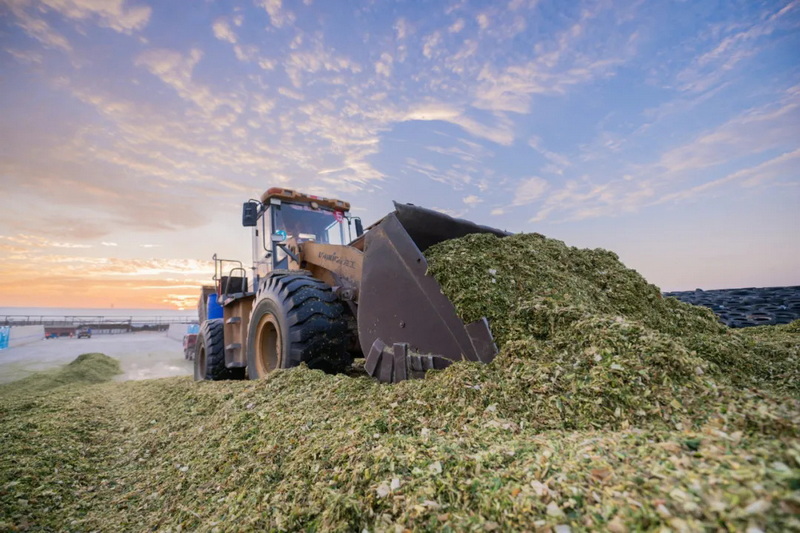 田间地头,车辆满载新收割的全株玉米,穿梭不绝;青贮窖边,工人们正有序进行压实与密封作业,他们正在用速度与专业,将新鲜的原料转化为营养丰富的优质饲料,为奶牛备足一整年可口且能量充沛的“黄金口粮”。
