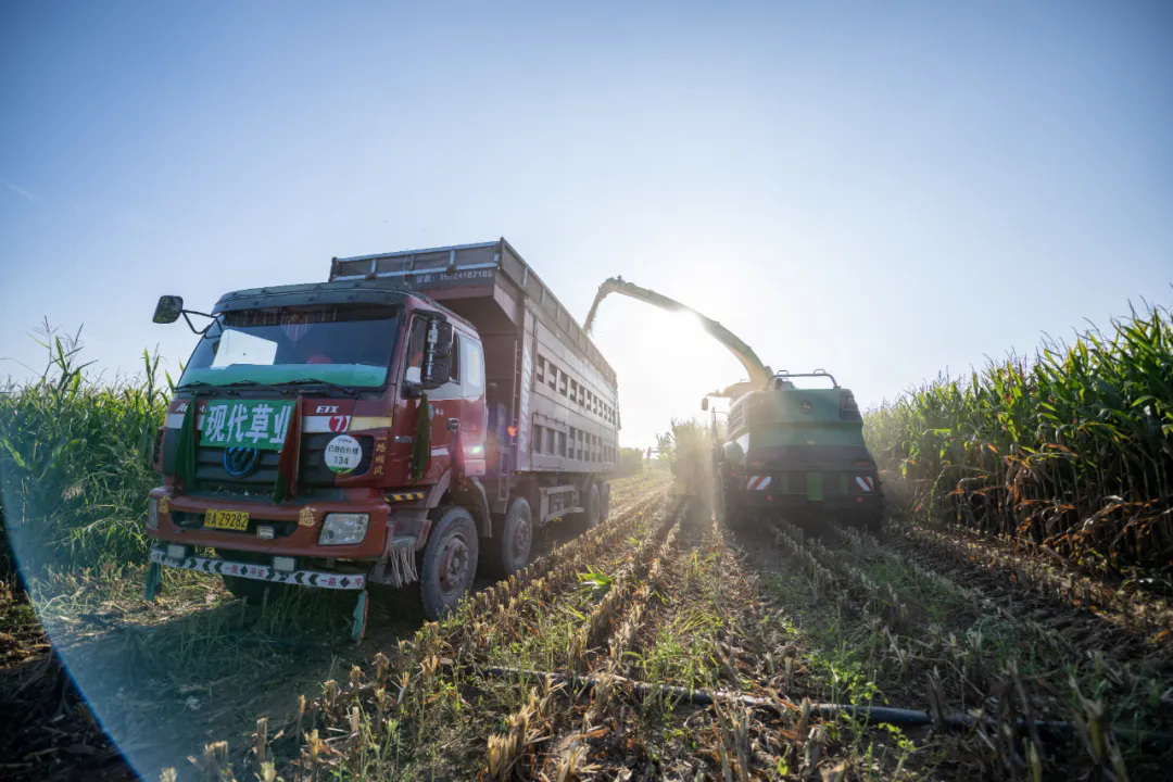 秋分清晨五点,牧场的自走式青贮收割机已轰鸣着驶入玉米地。