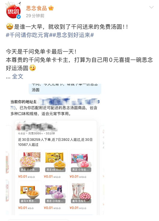 3月3日元宵节当天,思念汤圆、五芳斋、三全食品等汤圆品牌通过官方社交账号发文:“千问请你吃元宵,今天是免单卡最后一天,走过路过别错过。”有网友笑称,“汤圆品牌的时间点掐的真好,免单卡最后一天,把销量安排的明明白白。”