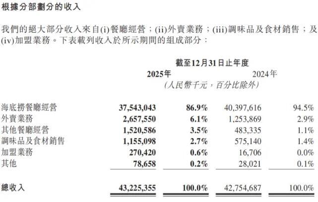 餐饮行业分析人士认为,从上述数据看,很明显海底捞主品牌在2025年表现不算好,客流和运营效率双双下降,最大的亮点是外卖收入翻倍,占营收比重从2.9%提升到6.1%。再加上“红石榴计划”20多个子品牌年收入15.2亿,占总营收3.5%。但这些加起来对业绩的整体贡献度仍然很低。门店数量方面,海底捞截至2025年底一共是1383家店,其中加盟店有79家,从扩张策略来看,海底捞在进一步转向保守。