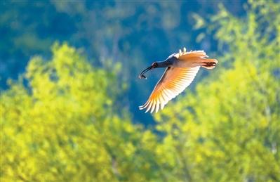 很快,一群长喙凤冠、红首白羽,被誉为“东方宝石”的朱鹮,掠过湖面,飞向湖心小岛,栖于茂密树枝上。