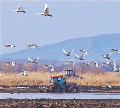 眼下,各地春耕一派繁忙。在黑龙江省同江市的一处水田里,正在作业的农机和起飞的天鹅同框,构成一幅灵动的春日画卷。刘万平摄(新华社发)