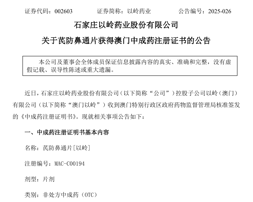 7月11日晚,以岭药业发布公告称,该公司控股子公司以岭(澳门)有限公司收到澳门特别行政区政府药物监督管理局(以下简称“澳门药监局”)核准签发的《中成药注册证明书》。