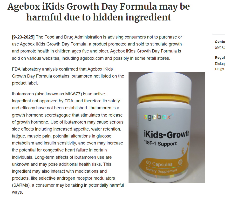不过,本周二(9月23日),美国食品药品监督管理局(FDA)终于在其官网上发布了一份通报,表示这种由美国企业生产的膳食补充剂,确实含有伊布莫仑这一物质,而且这种物质未被商家标出。