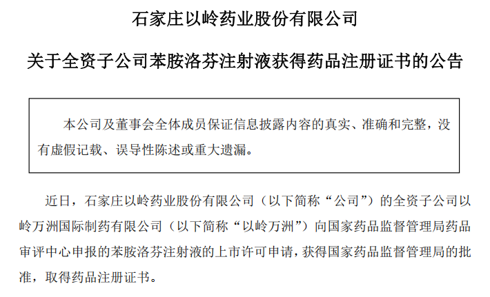 1月22日,以岭药业发布公告称,其全资子公司以岭万洲国际制药有限公司首个化药专利新药万舒安(苯胺洛芬注射液)获国家药监局批准上市。