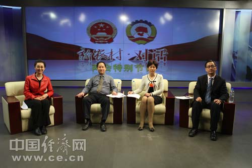 第十一届全国人大代表、山东临沭县农业局农经中心主任刘建文,农业部全国农业技术推广服务中心土肥处处长李荣,国家缓控释肥工程技术研究中心副主任、山东金正大公司副总经理陈宏坤做客中国经济网。(王耀峰 摄)