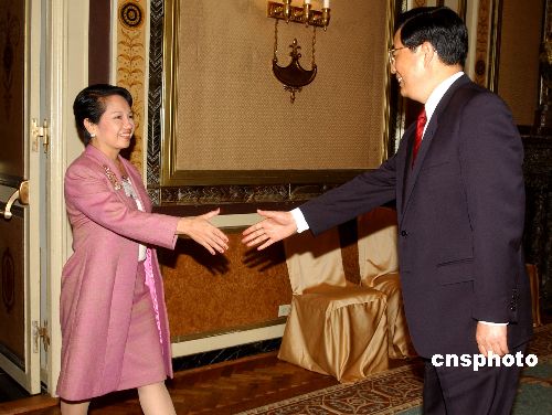 中新社资料图:中国国家主席胡锦涛会见菲律宾总统阿罗约。贾国荣摄