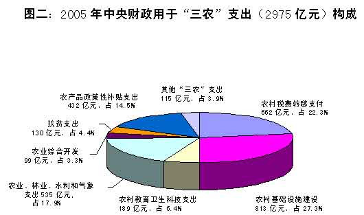 (二)大力支持解决“三农”问题,促进城乡协调发展。2005年财政支持“三农”继续保持了力度大、政策实、措施强的特点。全年仅中央财政用于“三农”的支出就达2975亿元,比2004年实际执行数增加349亿元,增长13.3%。一是不断深化农村税费改革。中央财政为此转移支付662亿元,比2004年增长26.3%。2005年,牧业税和除烟叶外的农业特产税已全部免征;免征农业税的省份达到28个,8亿农民受益。二是认真落实“三补贴”等政策。全国30个省份用于粮食直补的资金达到132亿元,比2004年增长13.8%。兑付良种补贴资金38.7亿元,比2004年增长35.8%。中央财政兑付农机具购置补贴资金3亿元,是2004年的4倍多。另外,落实专项资金55亿元,对产粮大县予以财力补助;对企业生产销售的尿素免征增值税,运用关税政策鼓励进口国内短缺的农业生产资料。调动了地方政府重农抓粮的积极性,维护了粮食安全。三是支持农业和农民长远发展。2005年中央财政用于农业农村基础设施建设的预算内基本建设投资和国债项目资金达812.78亿元,进一步改善了农村生产生活条件。中央财政用于农业综合开发资金98.55亿元,新增资金中76.6%用于粮食主产区中低产田改造的农业基础设施建设。同时,积极探索采用投资参股、专项贴息等形式,更加有效地发挥农业综合开发资金的引导、示范和带动效应。中央财政支持280万农村劳动力转移培训,补助资金4亿元,比2004年增长60%。不断增加用于扶贫开发方面的投入,2005年达到130亿元。中央财政安排资金251.7亿元,直接补贴退耕还林的农民。继续大力支持农业科技推广、农业产业化、农民专业合作组织发展、小型农田水利建设和测土配方施肥等。