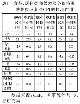 2006年1-2月份,食品价格、娱乐教育文化用品及服务价格同比涨幅与2005年同期相比都有较大的回落,分别回落4.0和2.3个百分点,对CPI的拉动作用分别下降1.37和0.35个百分点(表1),这是CPI同比涨幅回落的主要原因。CPI同比涨幅波动的主要原因是春节因素。