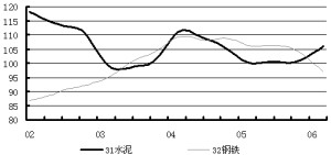 水泥、钢铁行业景气状况 钢铁和建材等作为投资的中间品,受宏观调控的影响较大。自2003年以来,国家通过紧缩土地和收紧银根来控制投资的过快增长,大规模的基础设施建设和房地产开发投资增速减缓。受投资增速下滑的影响,近几年,钢铁、水泥等行业景气波动较大。2003年4月,水泥景气行业下滑至低谷(97.7),此后的整个2005年,行业景气持续低位运行;钢铁行业自2004年开始景气持续下滑,至今年一季度,景气下降到96.94的低点。从结构升级的角度和市场竞争的程度来看,钢铁、水泥行业的阶段性调整仍将持续一段时间,但是,行业景气向好的势头已经开始显露。
