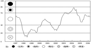 ■与一致合成指数的这种变化相似,4月份反映宏观经济运行状况的综合警情指数继续在绿灯区横向调整,从而进一步表明当前经济总体运行状况良好,并未出现过热的迹象。从综合警情指数的10大构成指标看,4月份其冷热状态与3月份完全一致,显示了经济运行的稳定性较好。
