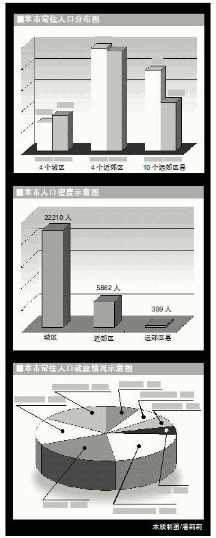 ●调查显示:2005年全市人口平均密度为每平方公里937人,比2000年增加了106人。其中,城区、近郊区、远郊区县的人口密度分别为每平方公里22210人、5862人、389人。