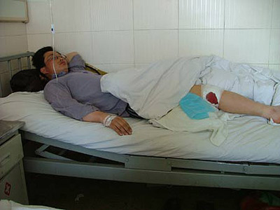 过路中年男子于雨被炸伤左腿。此人现在在医院里治疗。